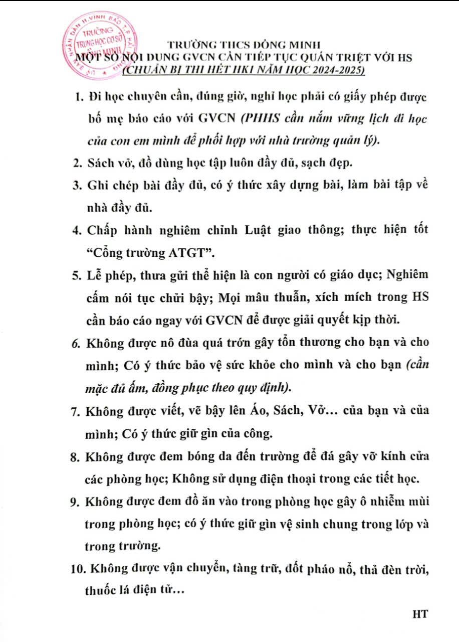 Bên cạnh đó, để chuẩn bị cho kiểm tra HK1 đạt kết quả tốt, cô TPT đã phát động Tuần lễ đăng ký học tốt (16-21/12/2024) chào mừng Ngày thành lập Quân đội nhân dân VN & Ngày QPTD (22/12); đồng thời phổ biến 10 nội dung mà BGH đề nghị GVCN tiếp tục quán triệt tới HS (có VB gửi kèm).