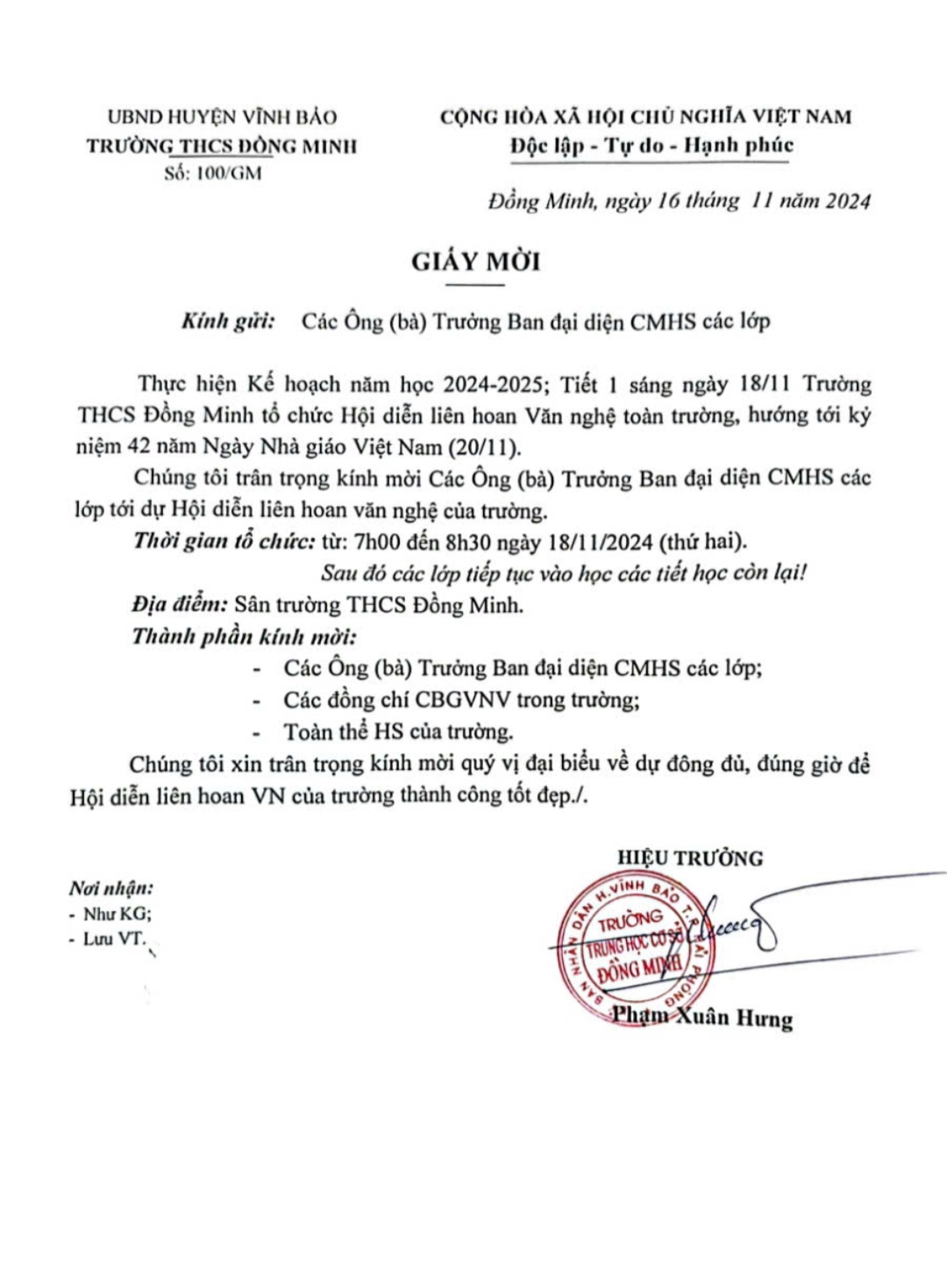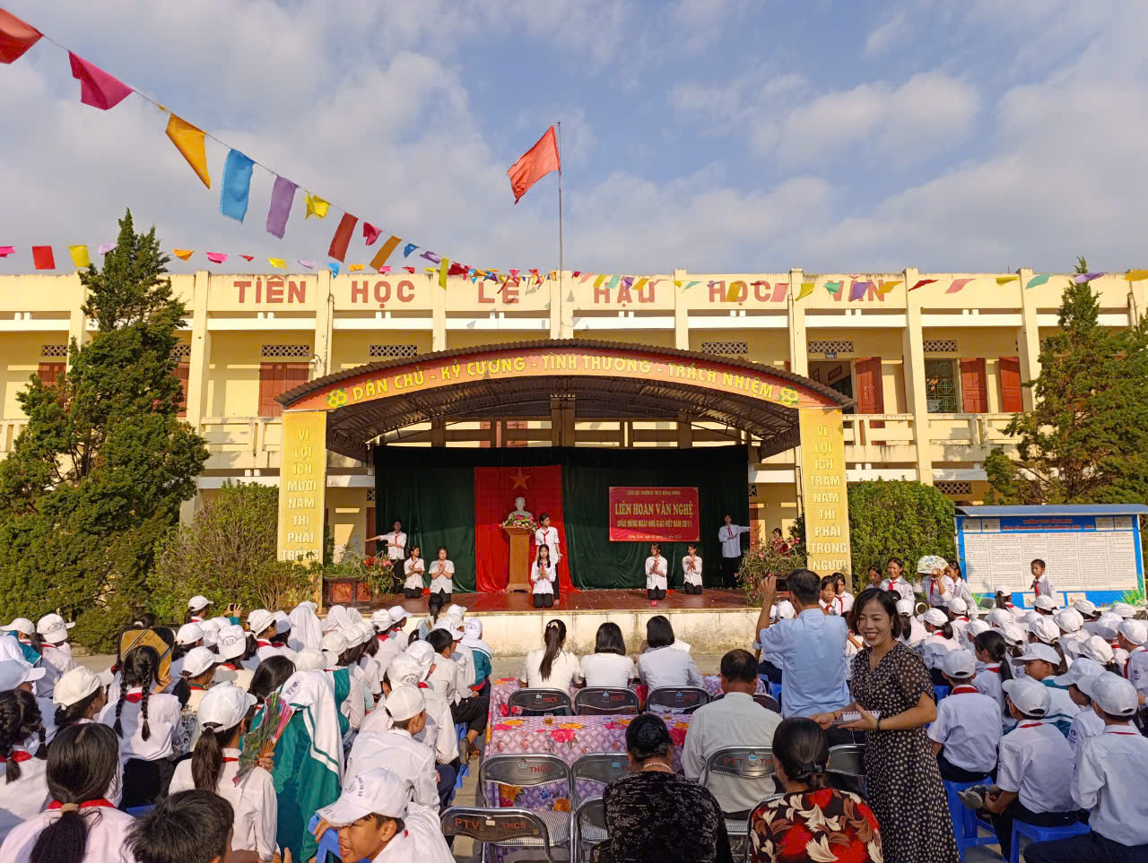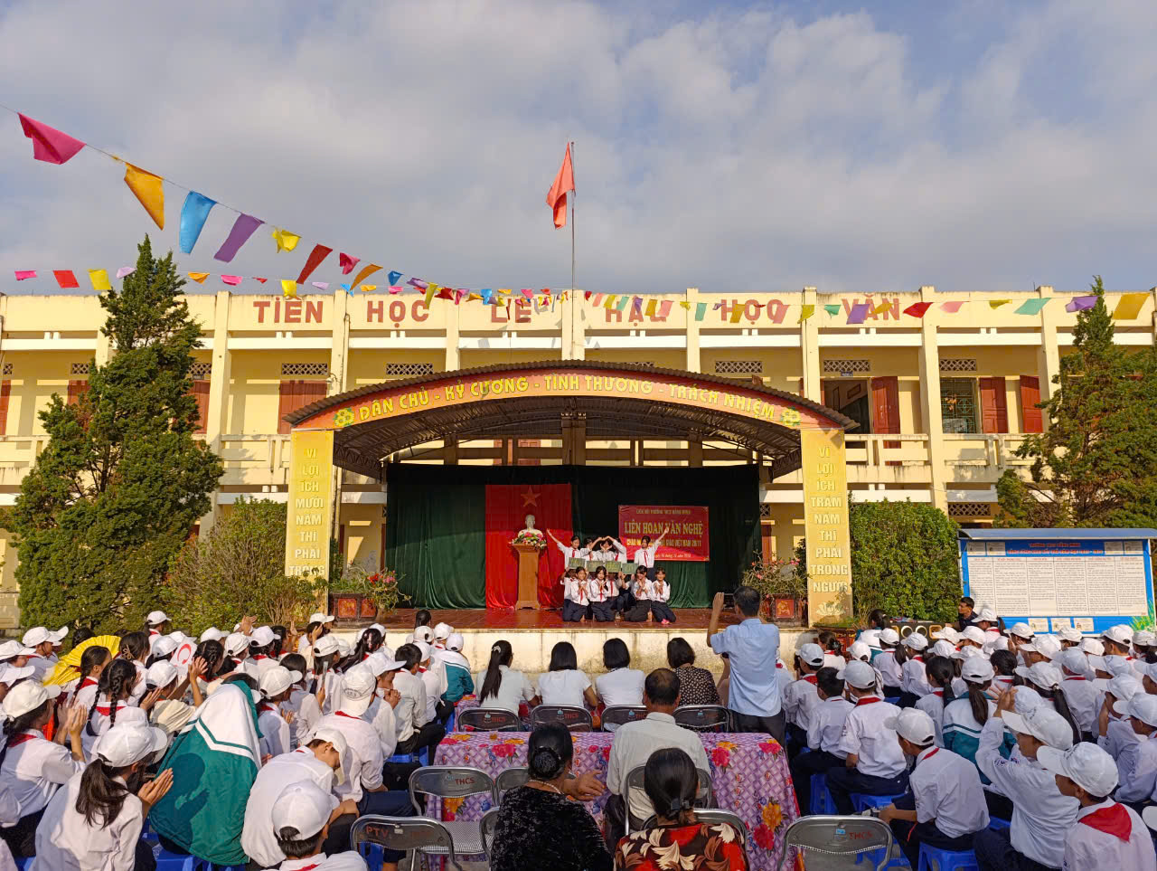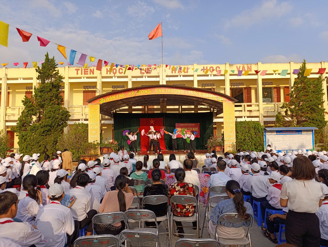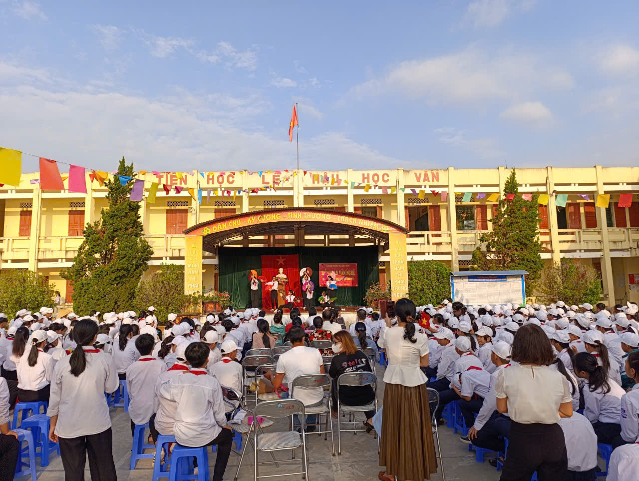 Thực hiện nhiệm vụ năm học và Kế hoạch hoạt động công tác Đội, phong trào thiếu nhi năm học 2024 - 2025; hòa chung không khí hân hoan của cả nước hướng tới chào mừng 42 năm Ngày Nhà giáo Việt Nam (20/11/1982-20/11/2024), vào tiết chào cờ sáng ngày 18/11/2024, trường THCS Đồng Minh đã tổ chức Liên hoan nghệ thuật cho học sinh toàn trường; Với mục đích tạo cho các em học sinh có một sân chơi lành mạnh, bổ ích sau những giờ phút miệt mài học tập; tạo không khí thi đua vui tươi, phấn khởi trong nhà trường; đồng thời góp phần giáo dục cho các em học sinh ý thức tổ chức kỉ luật, tinh thần đoàn kết, học hỏi lẫn nhau, rèn luyện các kĩ năng để phát triển toàn diện trong cuộc sống.