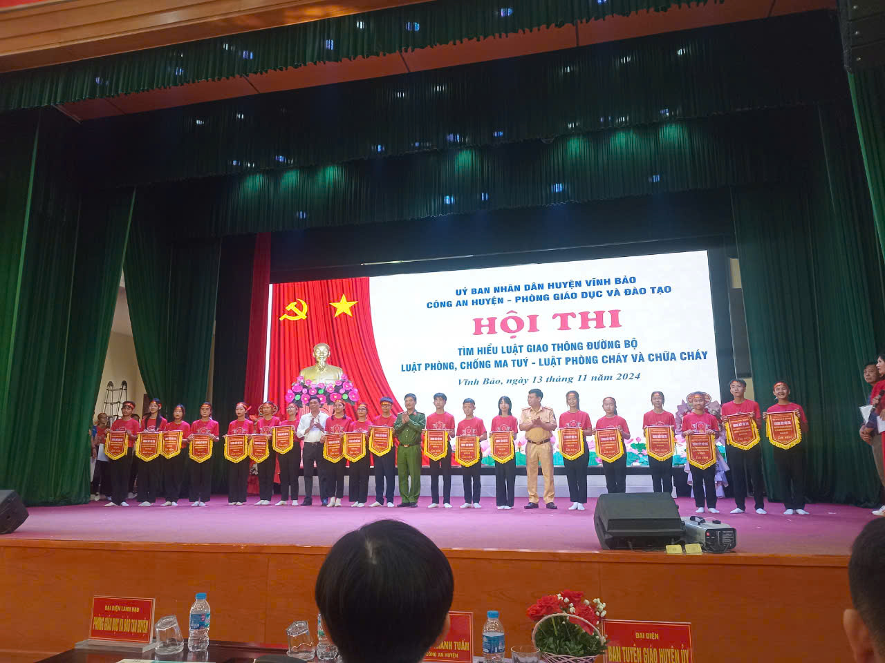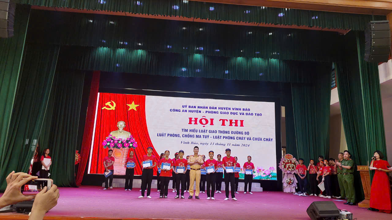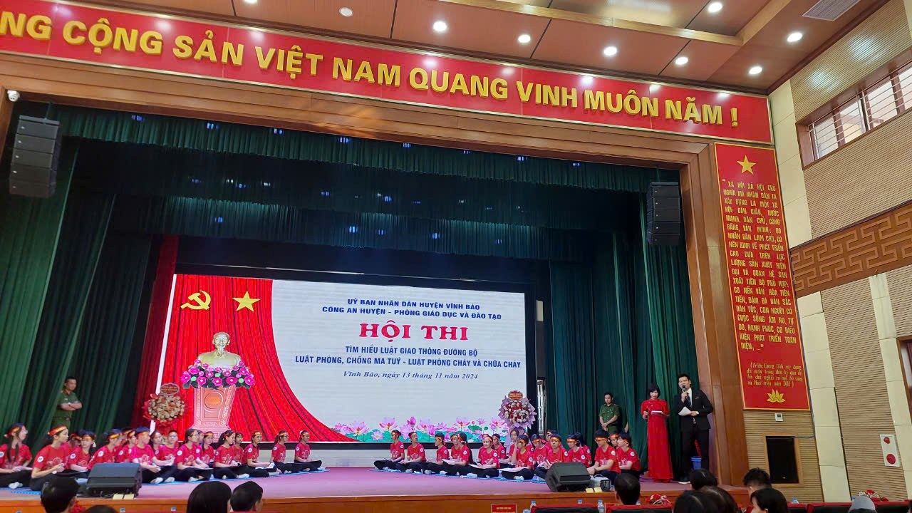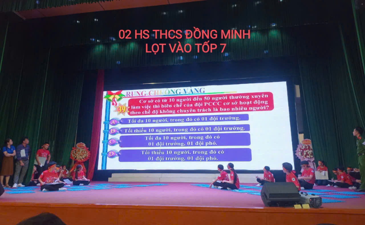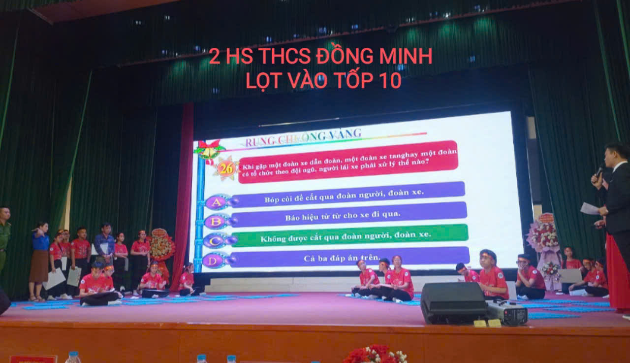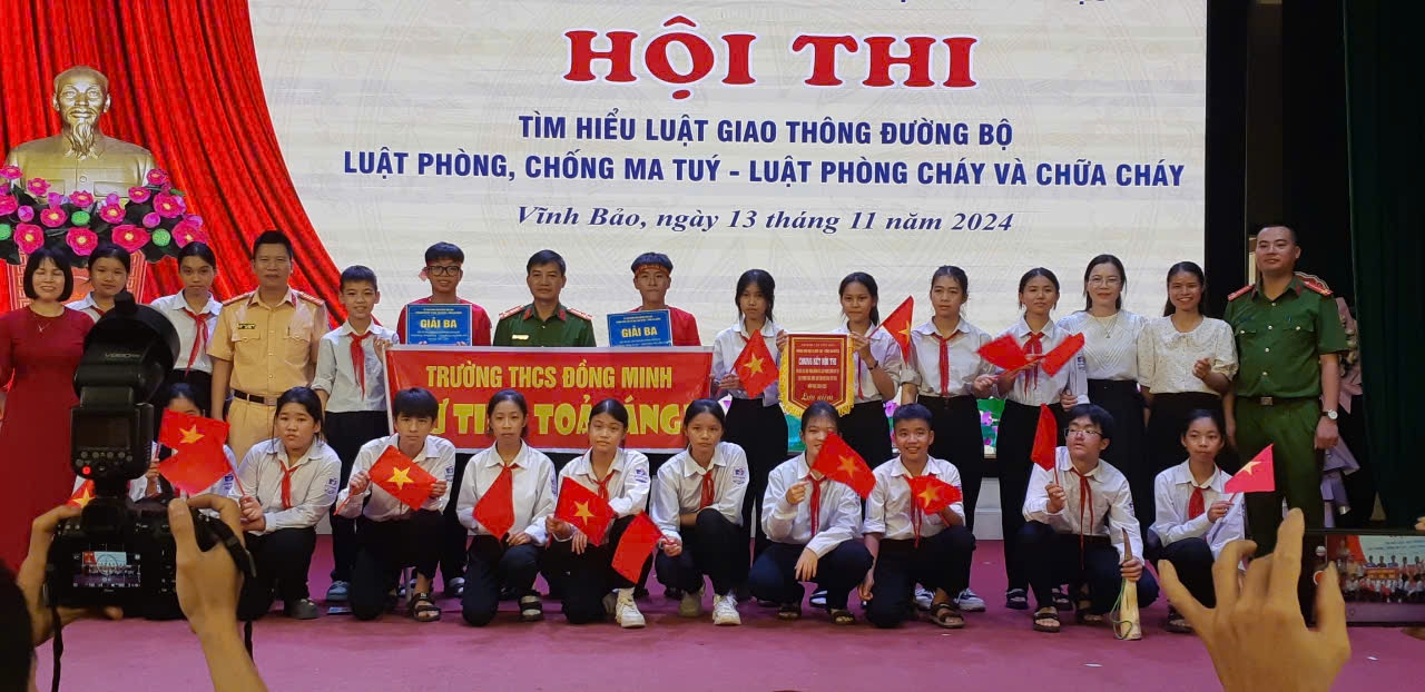 Thực hiện Kế hoạch số 879/KH-GDĐT-CAH, ngày 03/10/2024 của Phòng GD-ĐT & Công An huyện Vĩnh Bảo về việc Tổ chức Hội thi tìm hiểu Luật giao thông đường bộ, Luật phòng chống ma túy, Luật phòng cháy chữa cháy đối với HS các trường THCS trên địa bàn huyện Vĩnh Bảo, năm học 2024-2025; Sáng ngày 13/11/2024 Liên Đội Trường THCS Đồng Minh đã cử 02 em: Nguyễn Tiến Dũng SBD 06, Nguyễn Thành Vinh SBD 36; Cùng 20 em HS lớp 8A đại diện đi tham dự và cổ vũ Hội thi của huyện, tại Nhà hát Nguyễn Bỉnh Khiêm.