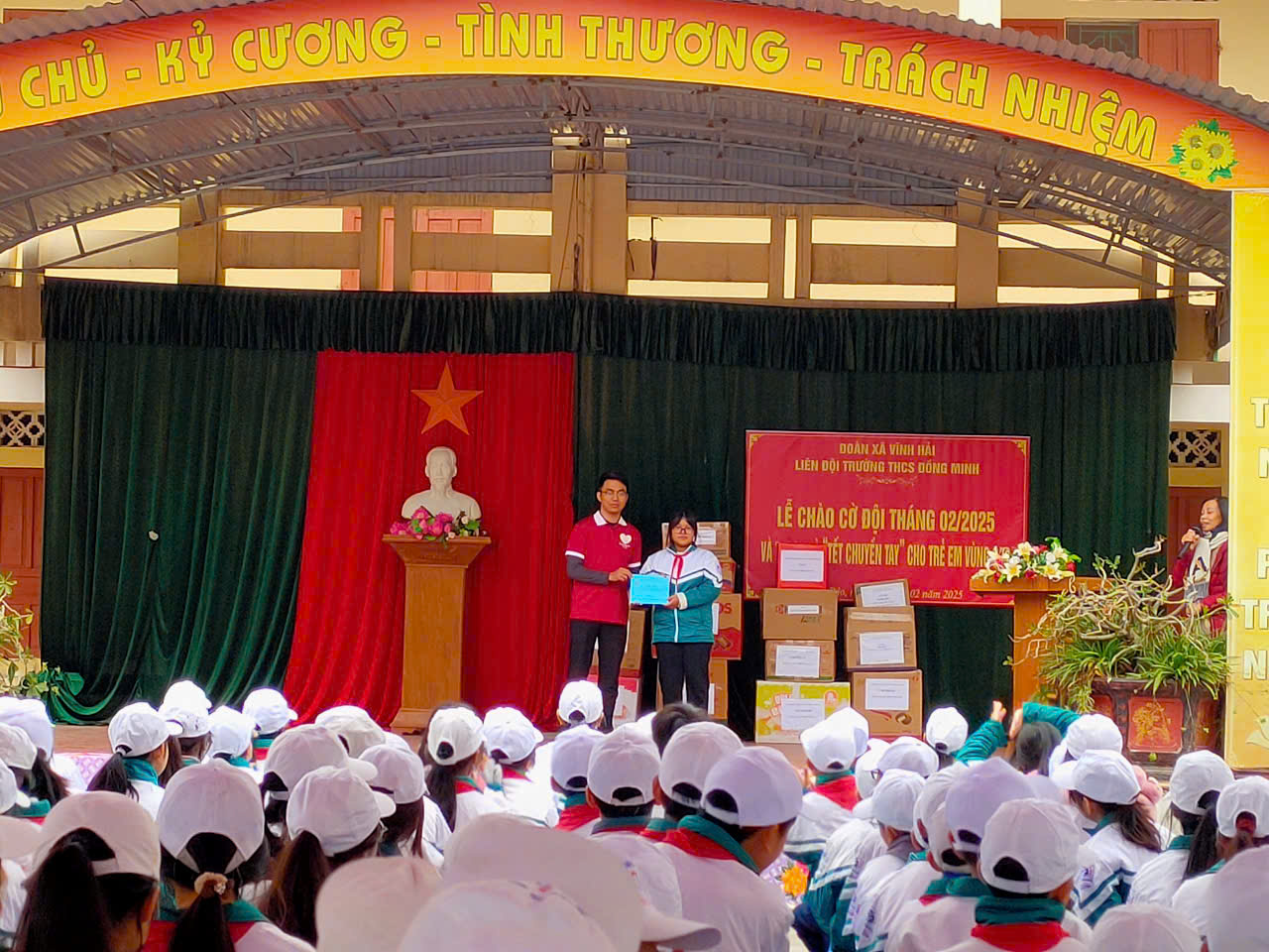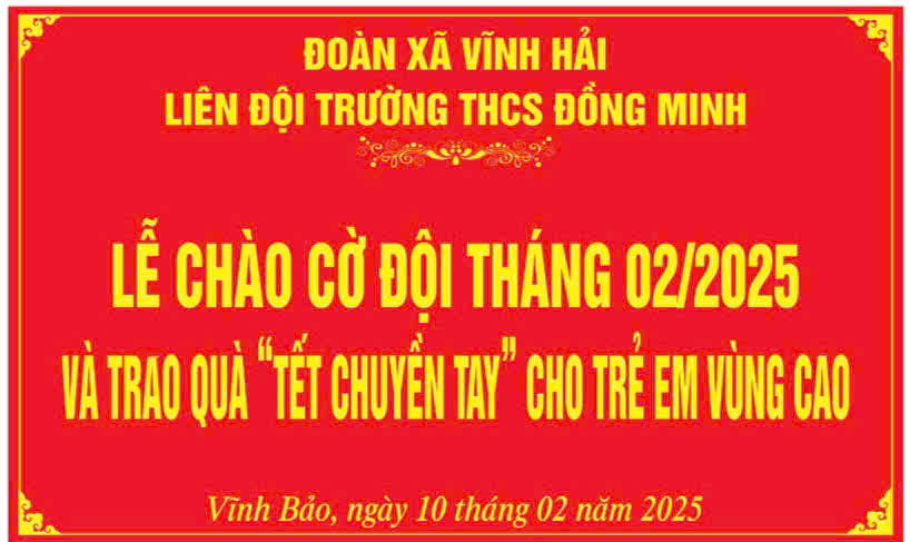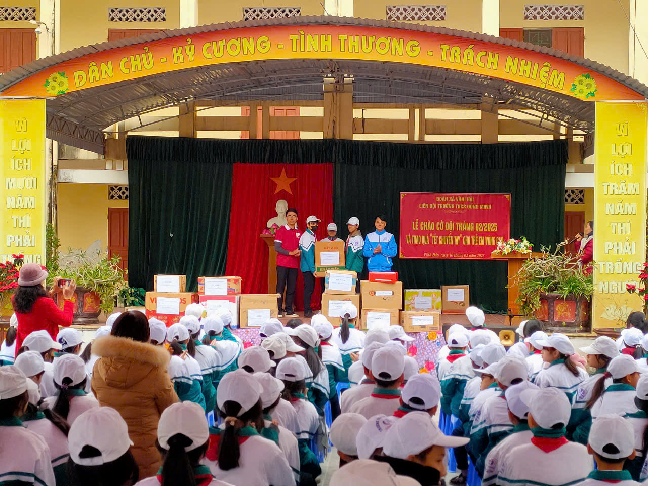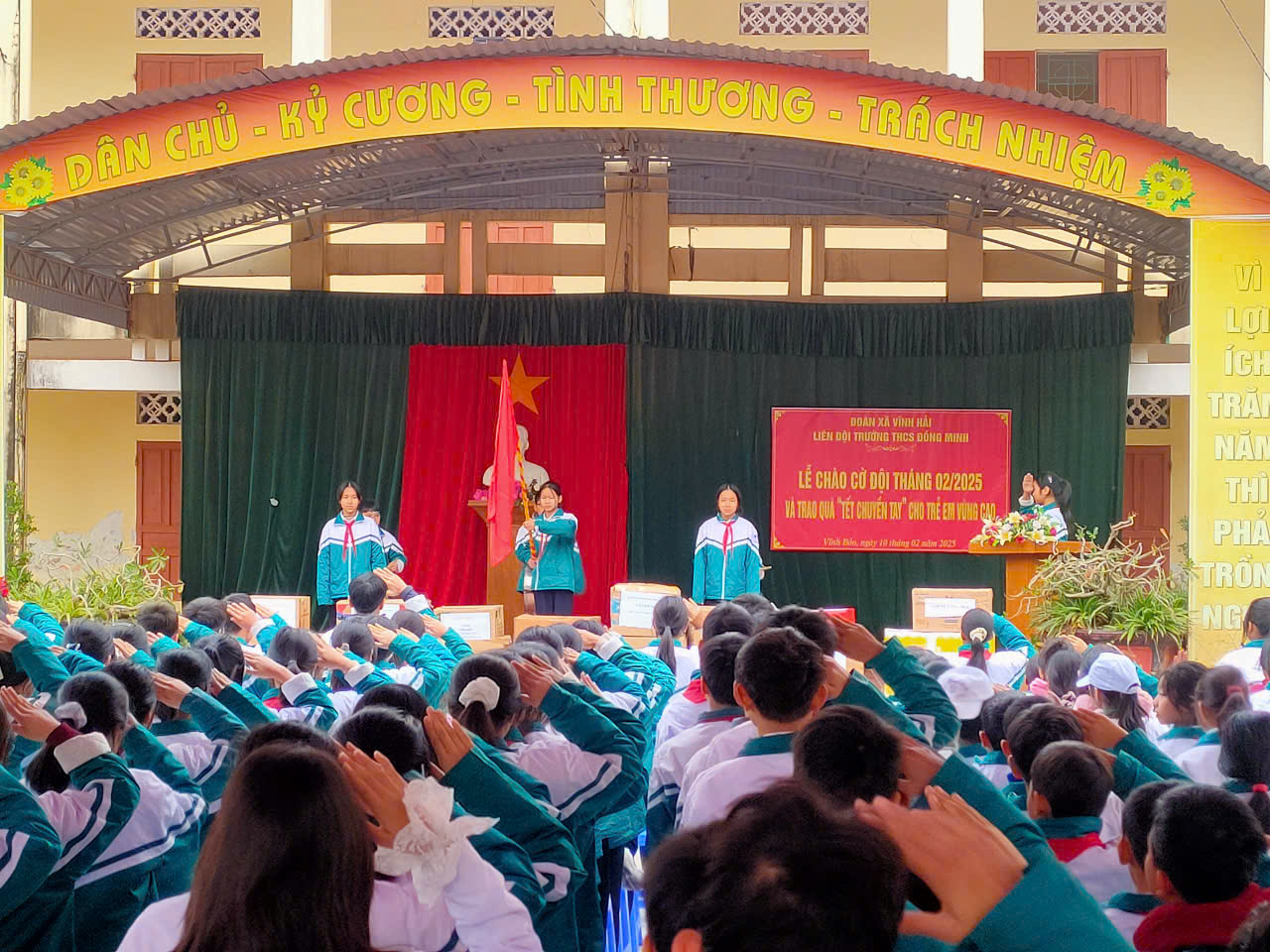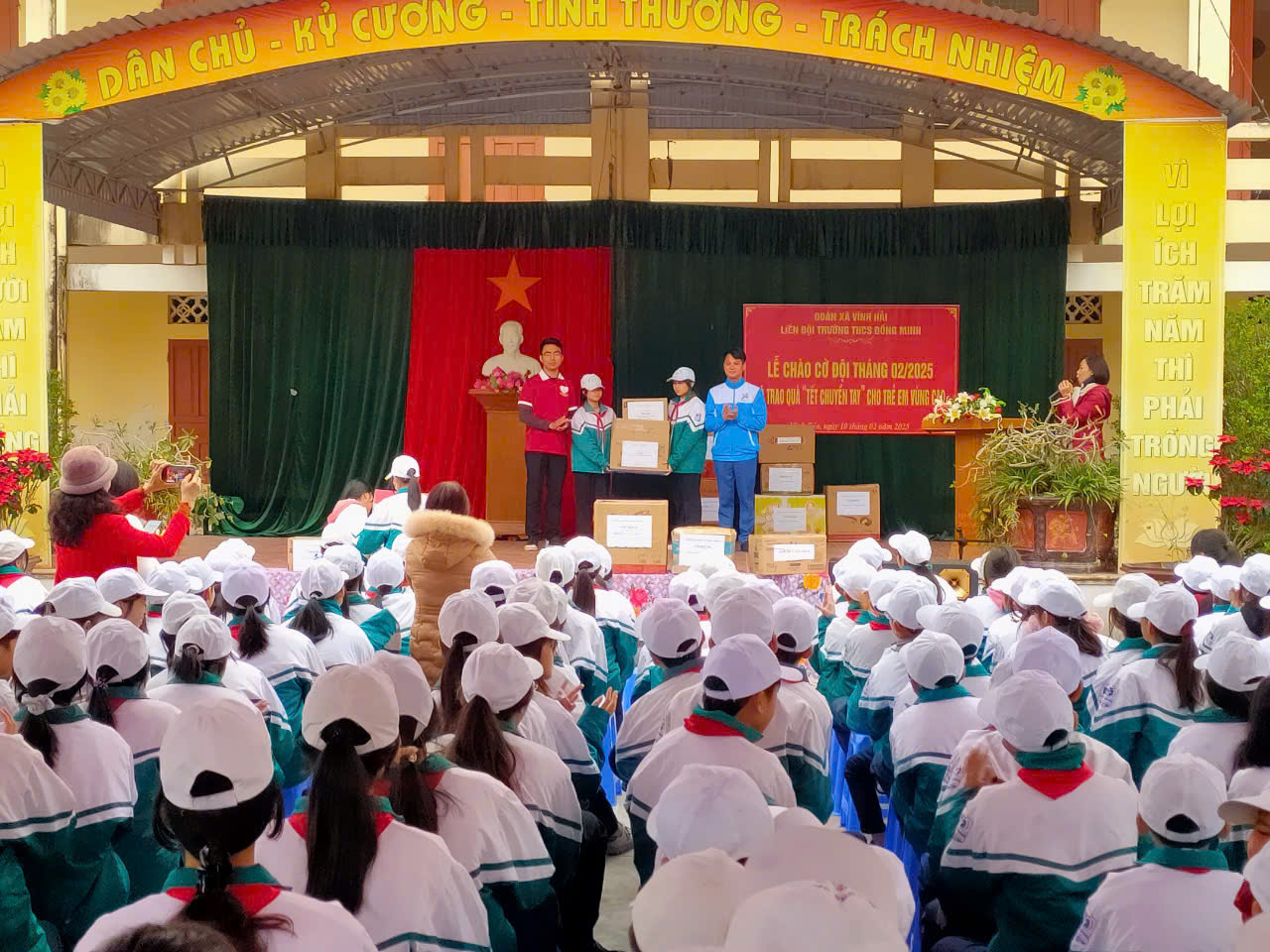 Thực hiện kế hoạch năm học 2024-2025, Kế hoạch số 01/KH-BĐH/LHs25 của Trung tâm tình nguyện Quốc gia; Sáng ngày 10/02/2025 Trường THCS Đồng Minh long trọng tổ chức Lễ chào cờ Đội đầu tháng 02/2025 và trao quà “Tết chuyền tay” năm 2025 cho trẻ em vùng cao.