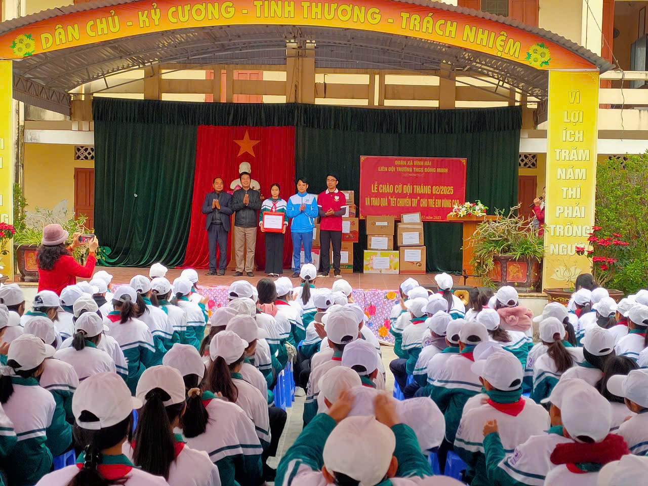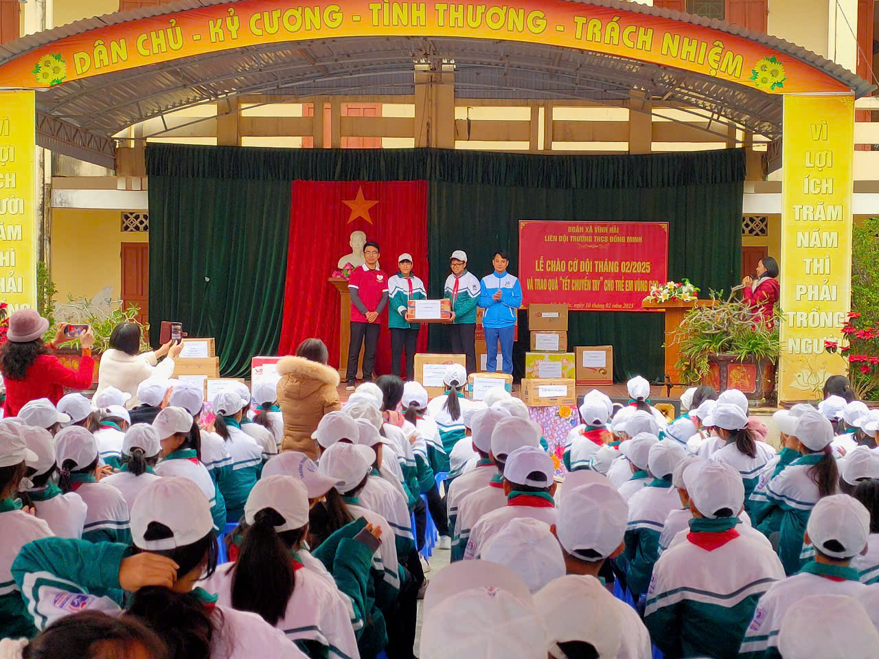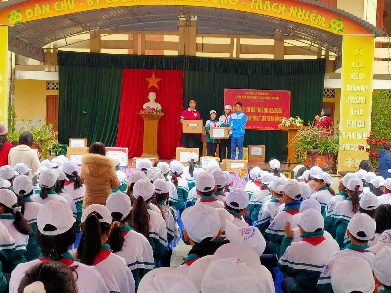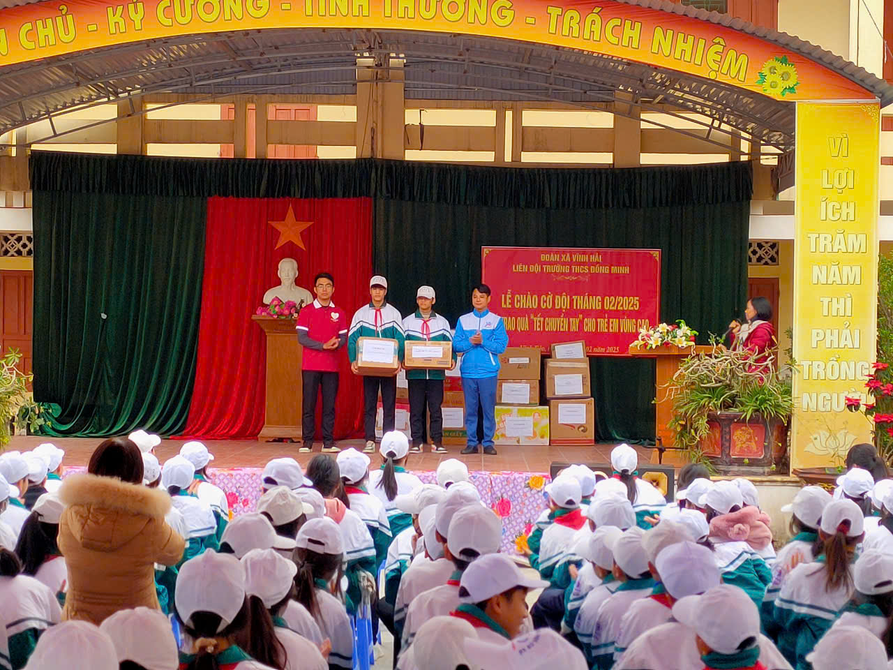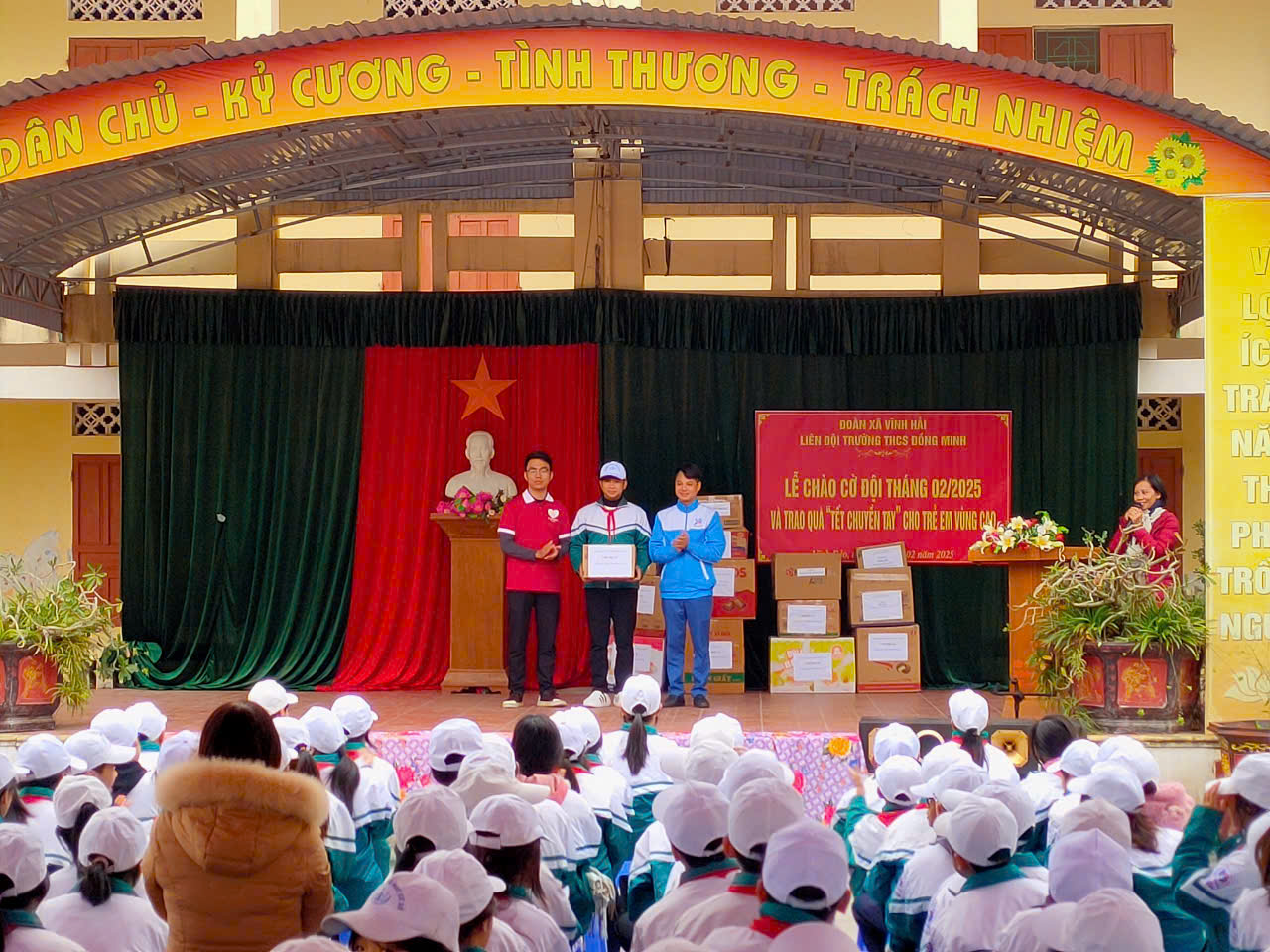 Thực hiện kế hoạch năm học 2024-2025, Kế hoạch số 01/KH-BĐH/LHs25 của Trung tâm tình nguyện Quốc gia; Sáng ngày 10/02/2025 Trường THCS Đồng Minh long trọng tổ chức Lễ chào cờ Đội đầu tháng 02/2025 và trao quà “Tết chuyền tay” năm 2025 cho trẻ em vùng cao.