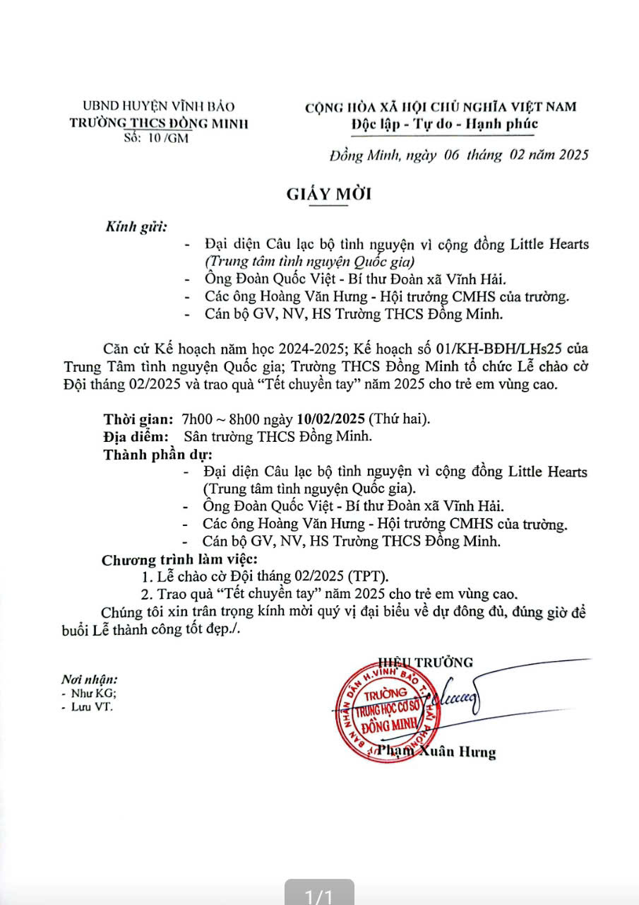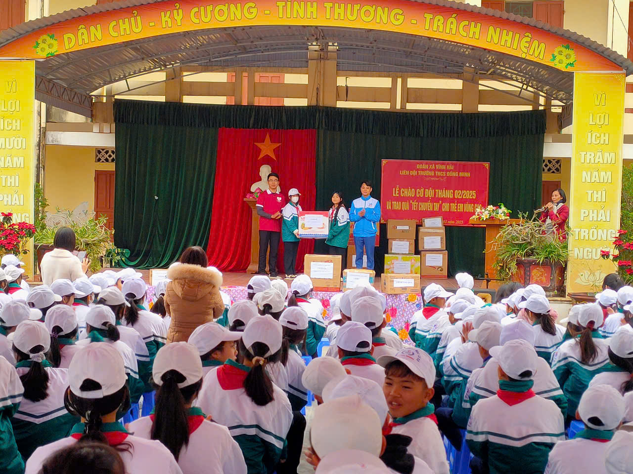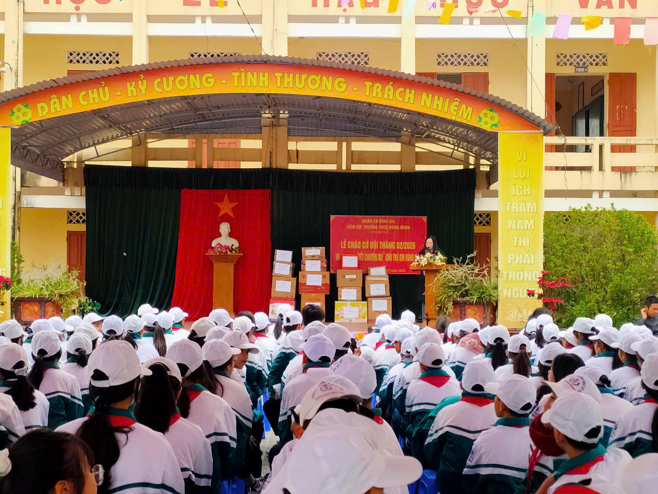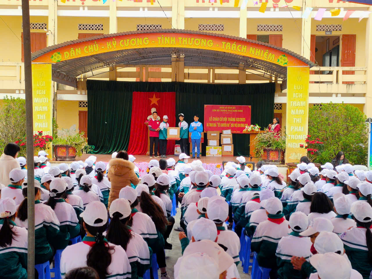Thực hiện kế hoạch năm học 2024-2025, Kế hoạch số 01/KH-BĐH/LHs25 của Trung tâm tình nguyện Quốc gia; Sáng ngày 10/02/2025 Trường THCS Đồng Minh long trọng tổ chức Lễ chào cờ Đội đầu tháng 02/2025 và trao quà “Tết chuyền tay” năm 2025 cho trẻ em vùng cao.