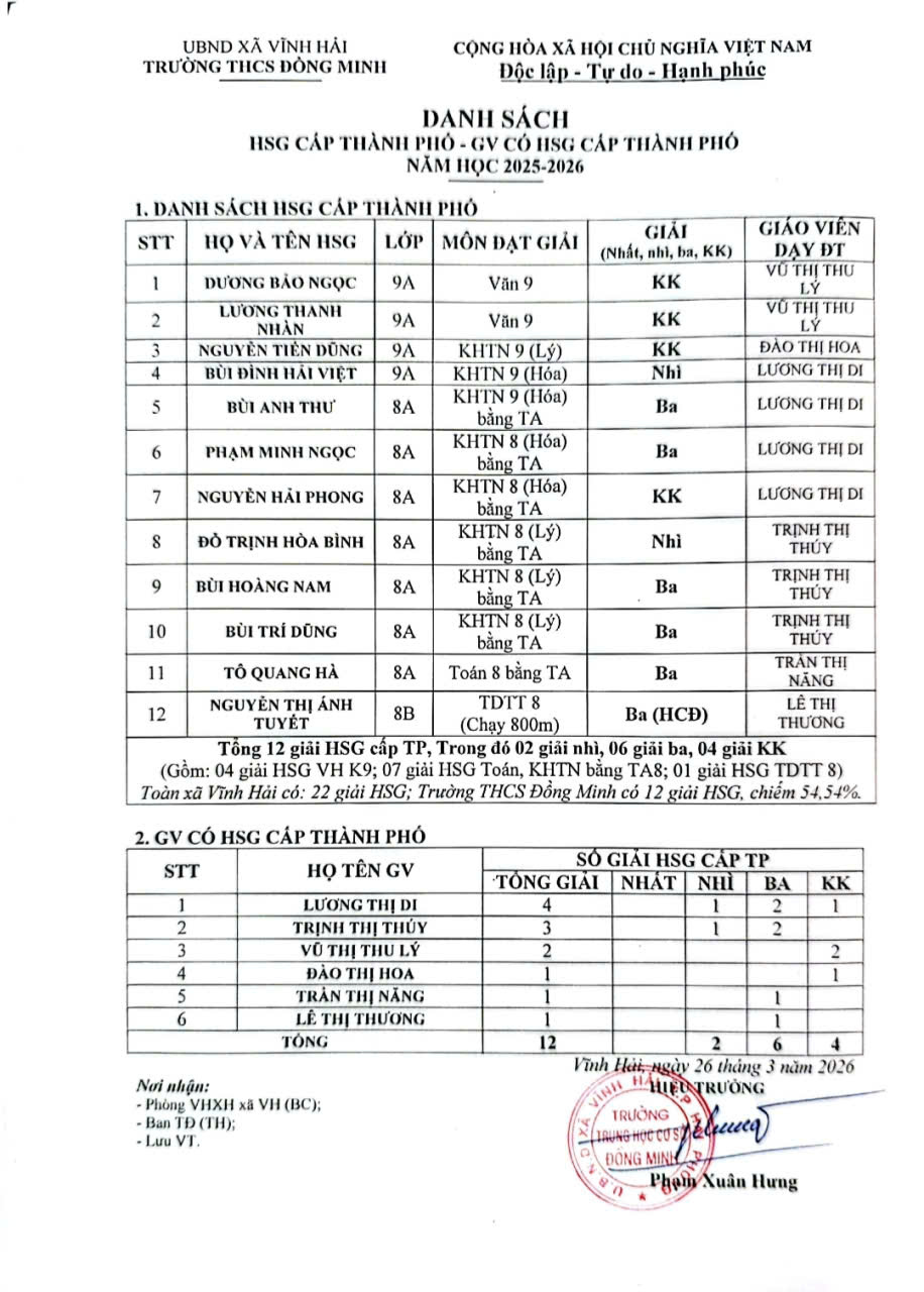 Với 12 giải HSG cấp thành phố danh giá (02 giải Nhì, 06 giải Ba, 04 giải Khuyến khích), THCS Đồng Minh đã xác lập một vị thế đầy kiêu hãnh. Một mình nhà trường đã mang về 54,54% (12/22) tổng số giải cho toàn xã Vĩnh Hải.