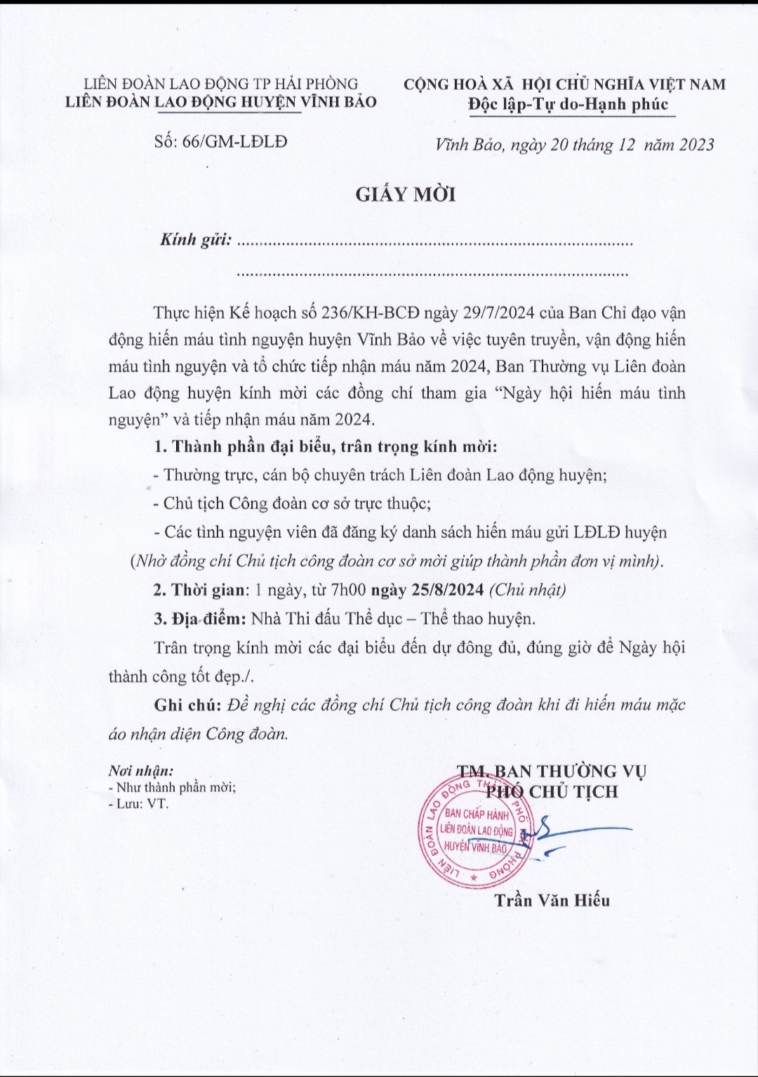 Thực hiện Kế hoạch 236/KH-BCĐ, ngày 29/7/2024 của Ban chỉ đạo vận động hiến máu tình nguyện huyện Vĩnh Bảo, sáng ngày 25/8/2024 dưới sự chủ trì của BCHCĐ trường, toàn thể CBVC&NLĐ Trường THCS Đồng Minh đã tới Nhà thi đấu TDTT huyện VB để cổ vũ tham gia hiến máu tình nguyện.