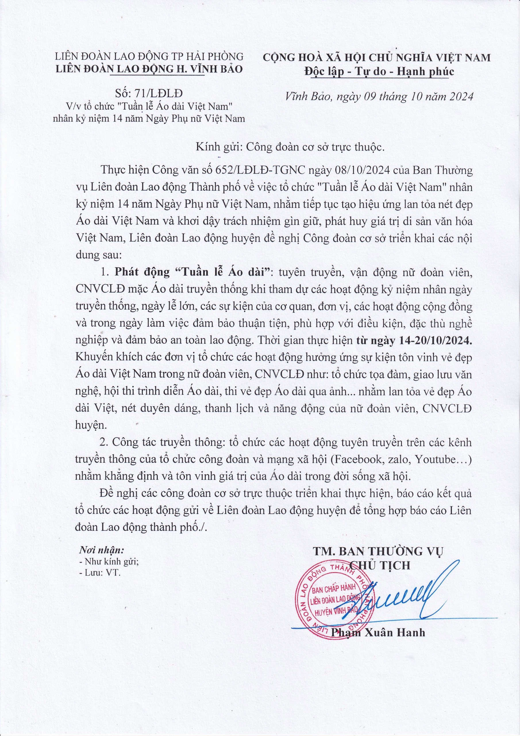 Thực hiện công văn chỉ đạo số 71/LĐLĐ, ngày 09/10/2024 của Liên đoàn lao động huyện Vĩnh Bảo về tổ chức “Tuần lễ áo dài Việt Nam” nhân kỷ niệm 14 năm Ngày Phụ nữ Việt Nam; BCHCĐ Trường THCS Đồng Minh đã phát động trong toàn thể CBVC&NLĐ nữ trong toàn trường tích cực hưởng ứng tham gia “Tuần lễ áo dài Việt Nam” từ 14/10 đến 20/10/2024.
