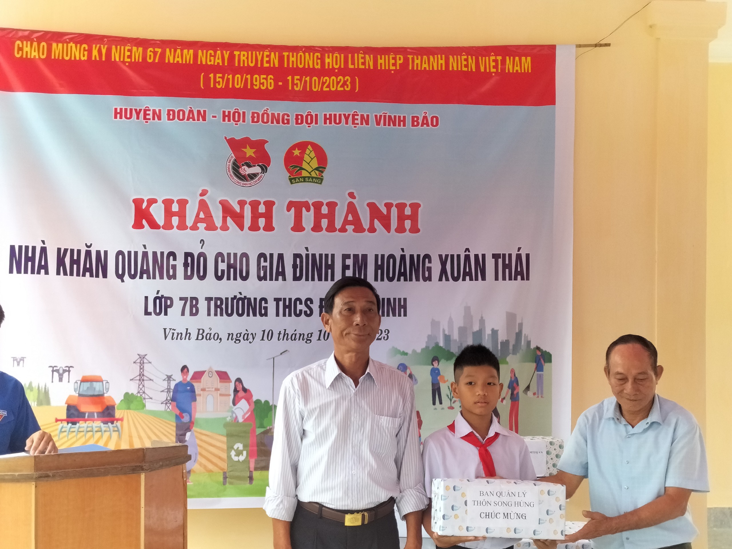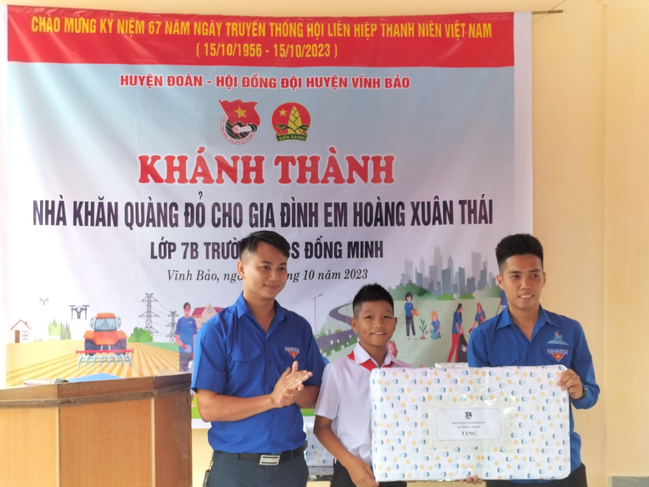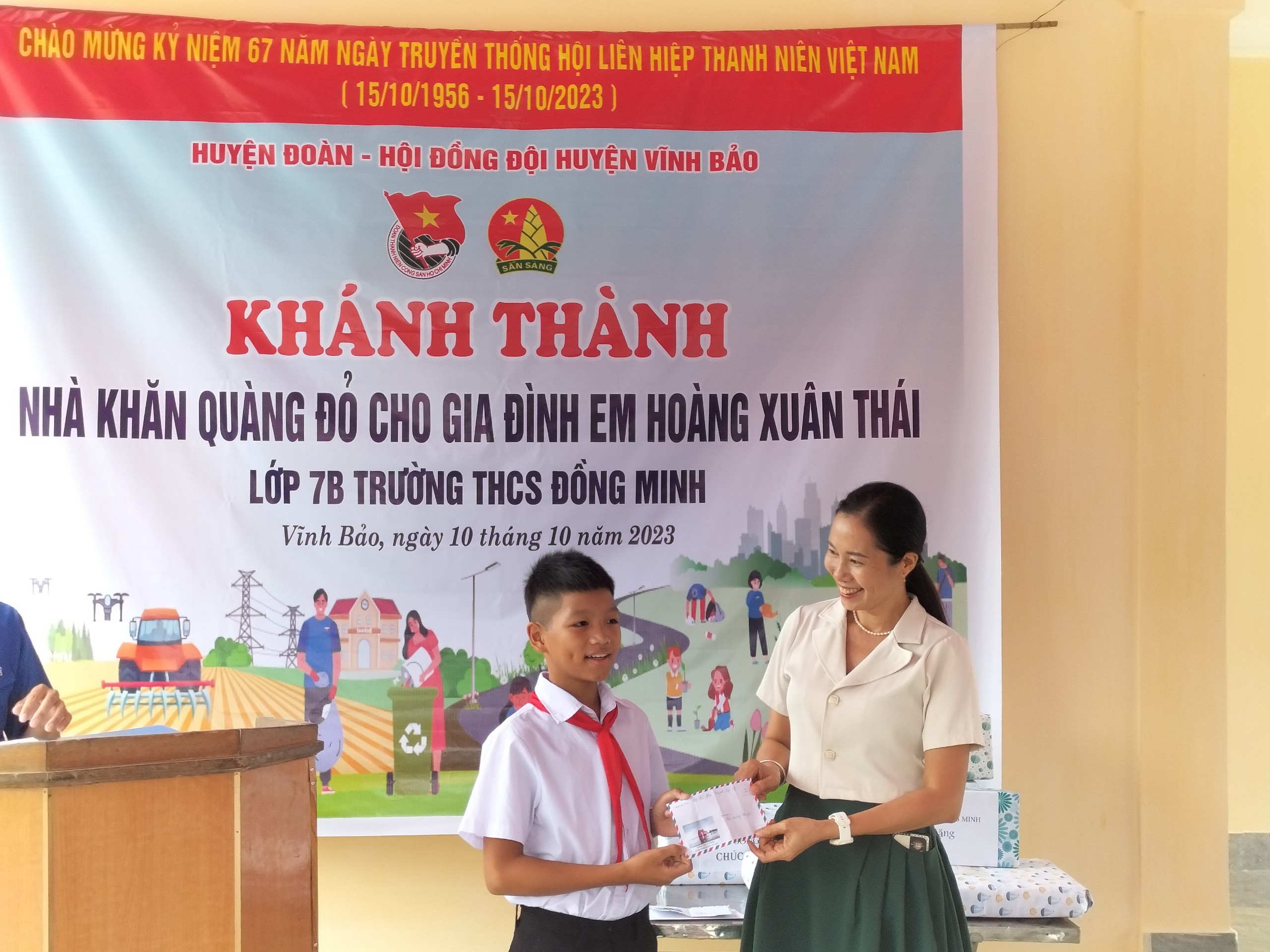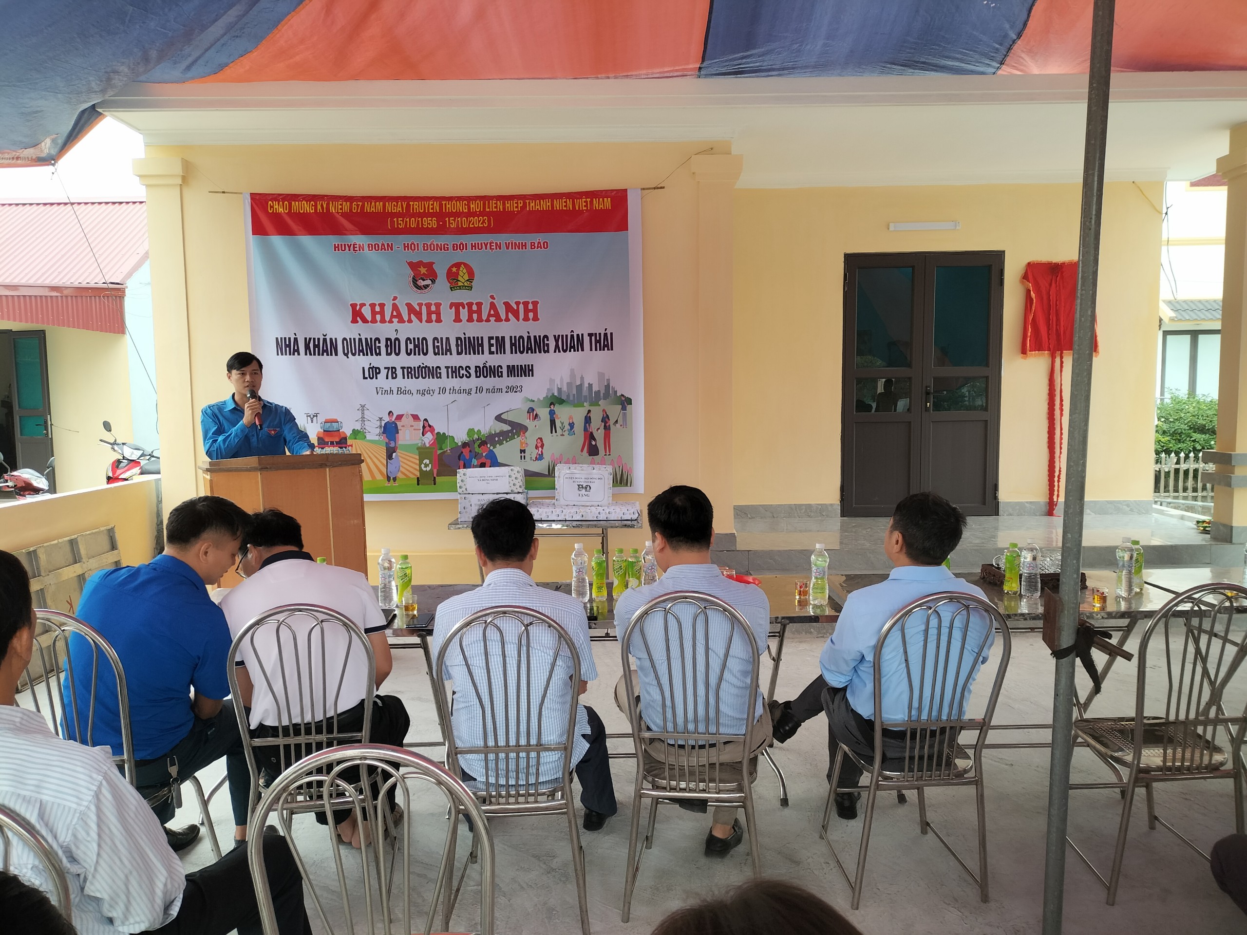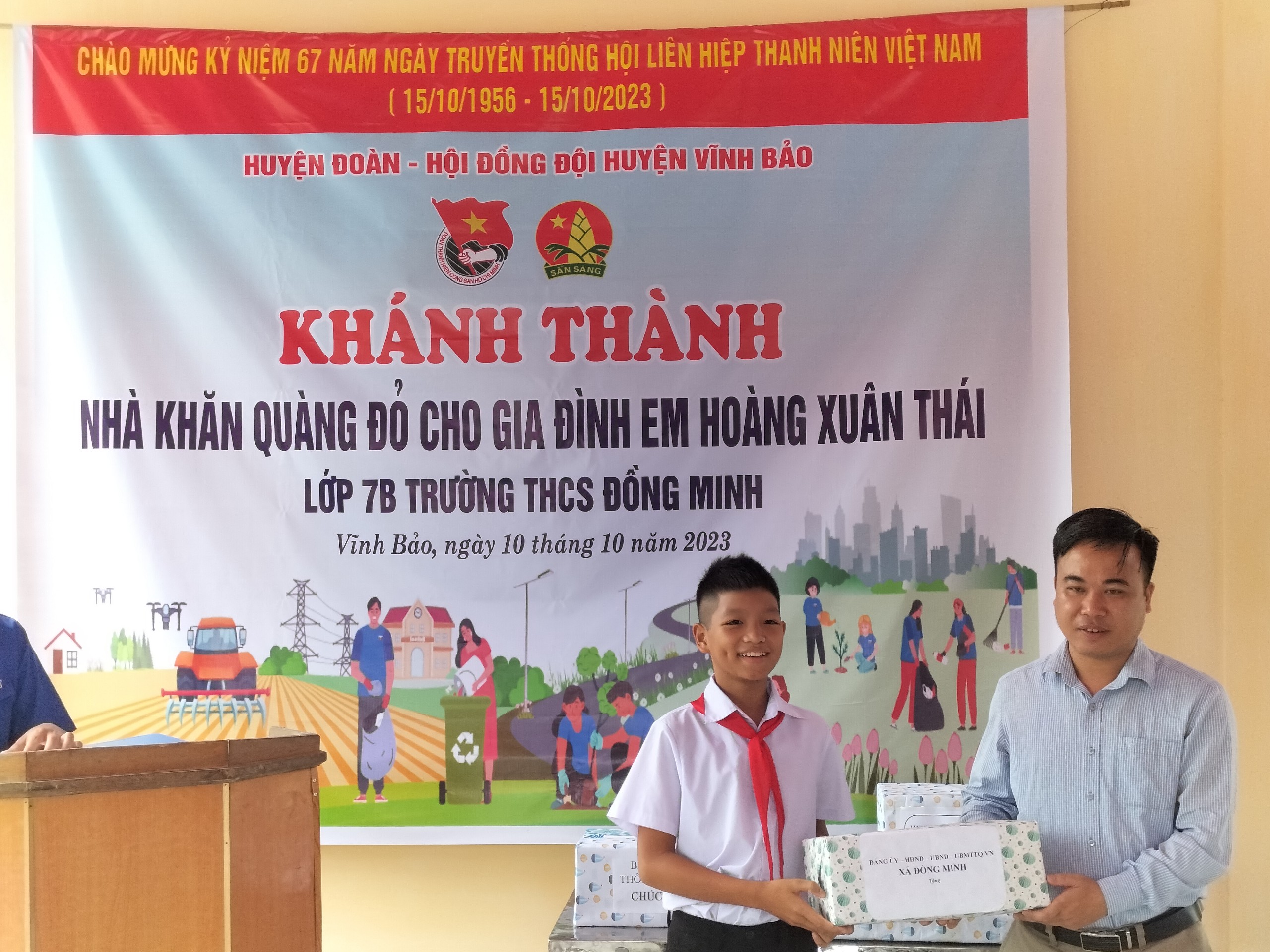 Hướng đến dịp kỷ niệm Ngày thành lập Hội liên hiệp Thanh niên Việt Nam (15/10), sáng ngày 10/10/2023 buổi lễ khánh thành căn nhà “Khăn quàng đỏ” đã được tổ chức tại thôn Song Hùng, xã Đồng Minh, huyện Vĩnh Bảo, TP Hải Phòng, về dự với buổi lễ có các đồng chí: Nguyễn Hữu Cường - Phó Trưởng Ban Dân vận huyện; Vũ Duy Minh - Bí thư Huyện đoàn Vĩnh Bảo; Đỗ Văn Lâm - Phó chủ tịch UBND; Phạm Văn Hùng - Phó chủ tịch HĐND; Đoàn Quốc Việt - Bí thư Đoàn xã Đồng Minh; Thầy giáo Phạm Xuân Hưng - BTCB Hiệu trưởng; Cô Vũ Thị Minh Tâm - Tổng phụ trách; Cô Đinh Thị Huế - GVCN lớp 7B trường THCS Đồng Minh và các ông (bà) BTCB, Trưởng thôn Song Hùng, đại diện Đoàn trường THPT Cộng Hiền…