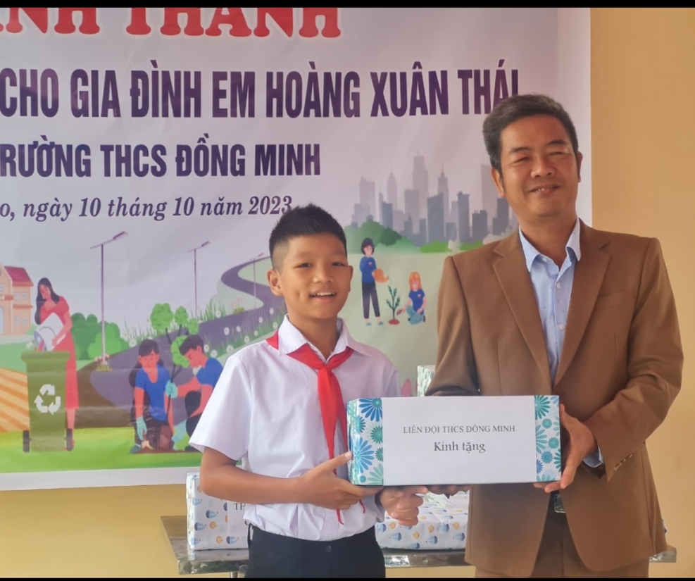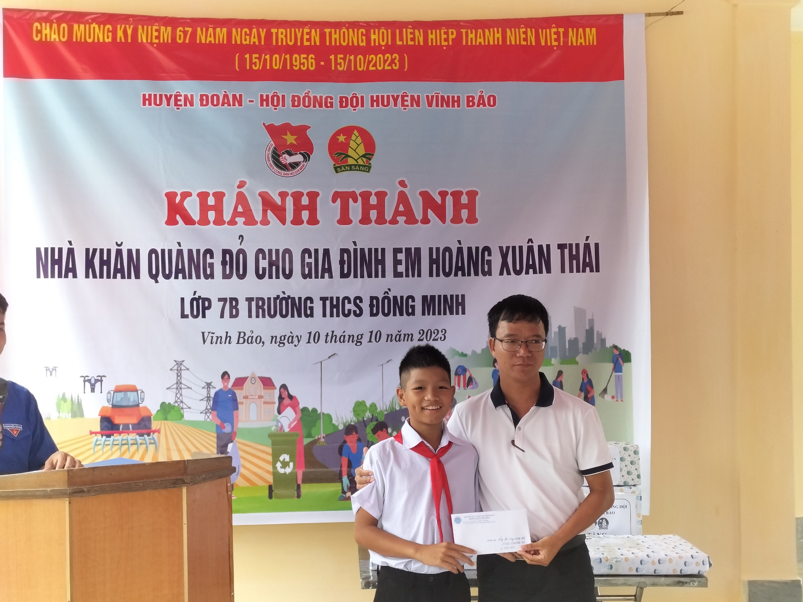 Xét hoàn cảnh gia đình em Hoàng Xuân Thái học sinh lớp 7B đặc biệt khó khăn - Bố bị bệnh trọng mất sớm; BGH&Liên Đội Trường THCS Đồng Minh đã tích cực đề nghị với cấp trên; Được sự nhất trí của UBND và BTV Đoàn xã Đồng Minh; Huyện Đoàn Vĩnh Bảo đã tham mưu với Thành Đoàn, UBND Thành phố Hải Phòng ủng hộ gia đình em Hoàng Xuân Thái 100.000.000 đồng để xây căn nhà “Khăn quàng đỏ” cho gia đình em.