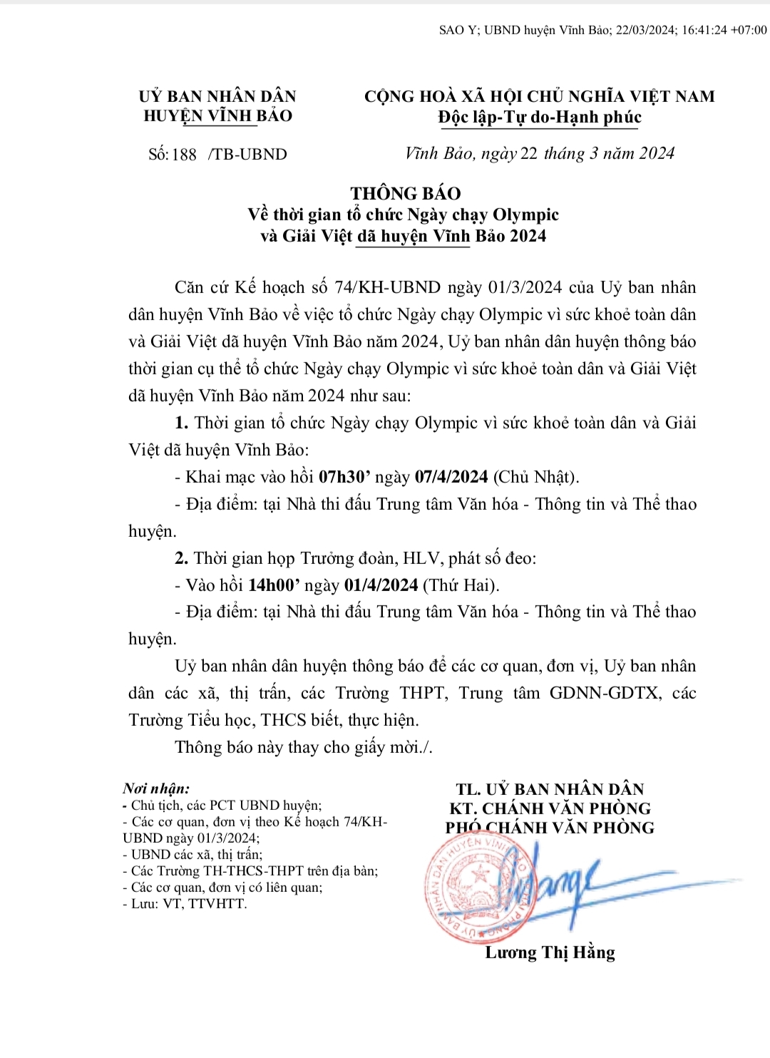 Thực hiện Thông báo số 188/TB-UBND, ngày 22/3/2024 của UBND huyện Vĩnh Bảo về việc tổ chức Ngày chạy Olympic và Giải Việt dã huyện Vĩnh Bảo năm 2024.